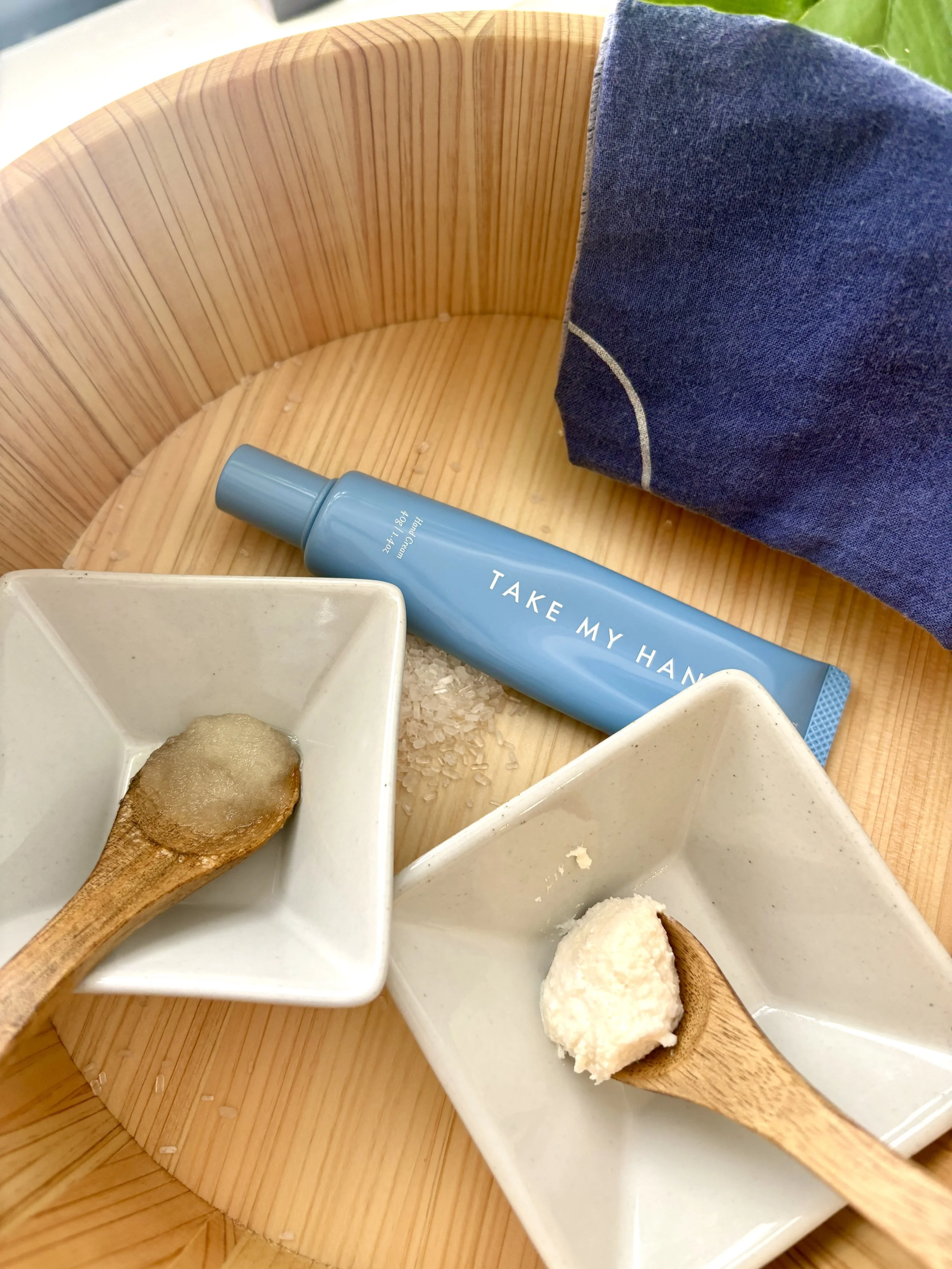 Soak your hands in a warm bath infused with hinoki-scented aroma bath salts using a traditional wooden bowl.
